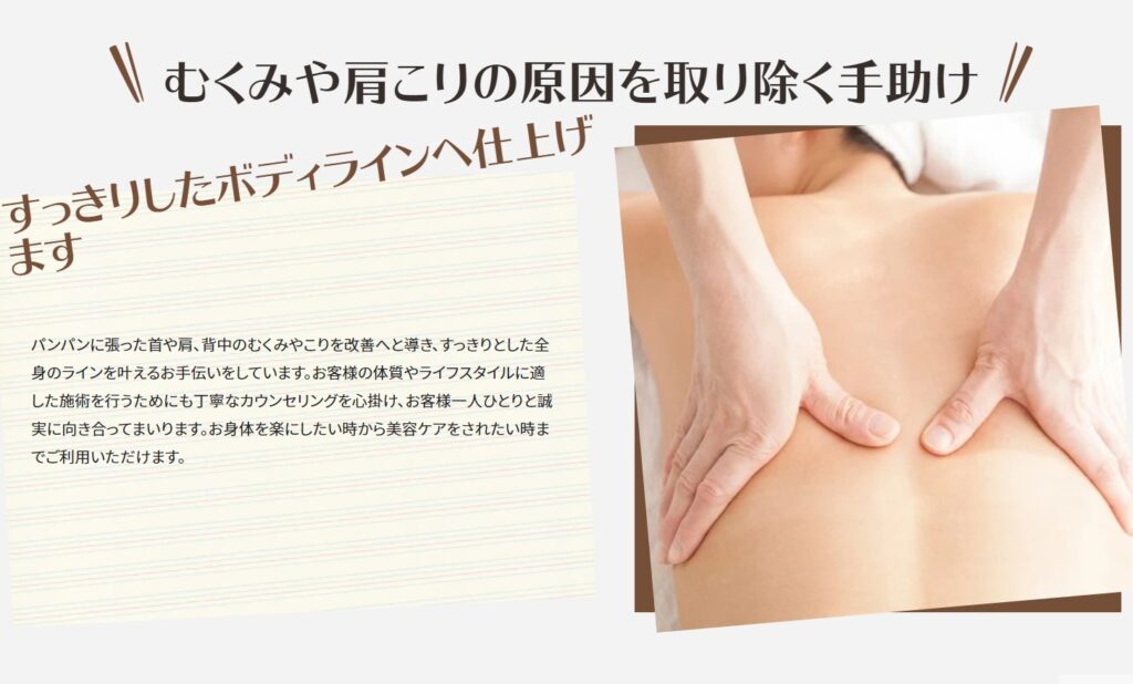 背中の張りや肩こり解消のために、このお店でマッサージを受ける人も多いですが、顧客の体の状態に合わせて、力加減を変えながら施術ができるところも、このお店の大きな強みになっています。
