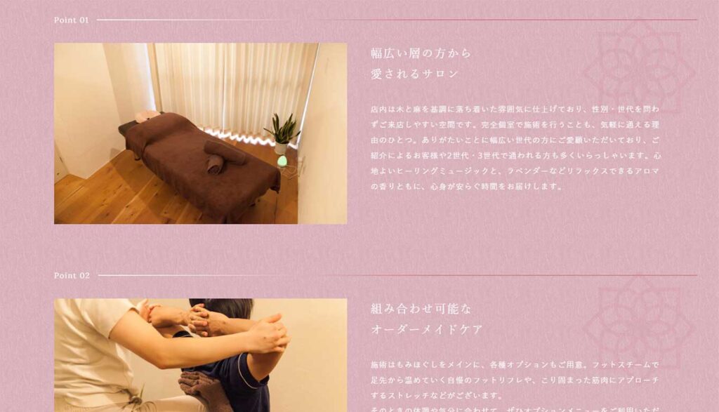 お勧めポイントの3つめは施術内容をオーダーメイドできる点です。Relaxation Salon powarupoはメニューの内容が豊富にあります。そして、そのメニュー内容と料金、施術に必要な時間はすべてホームページに記載されています。